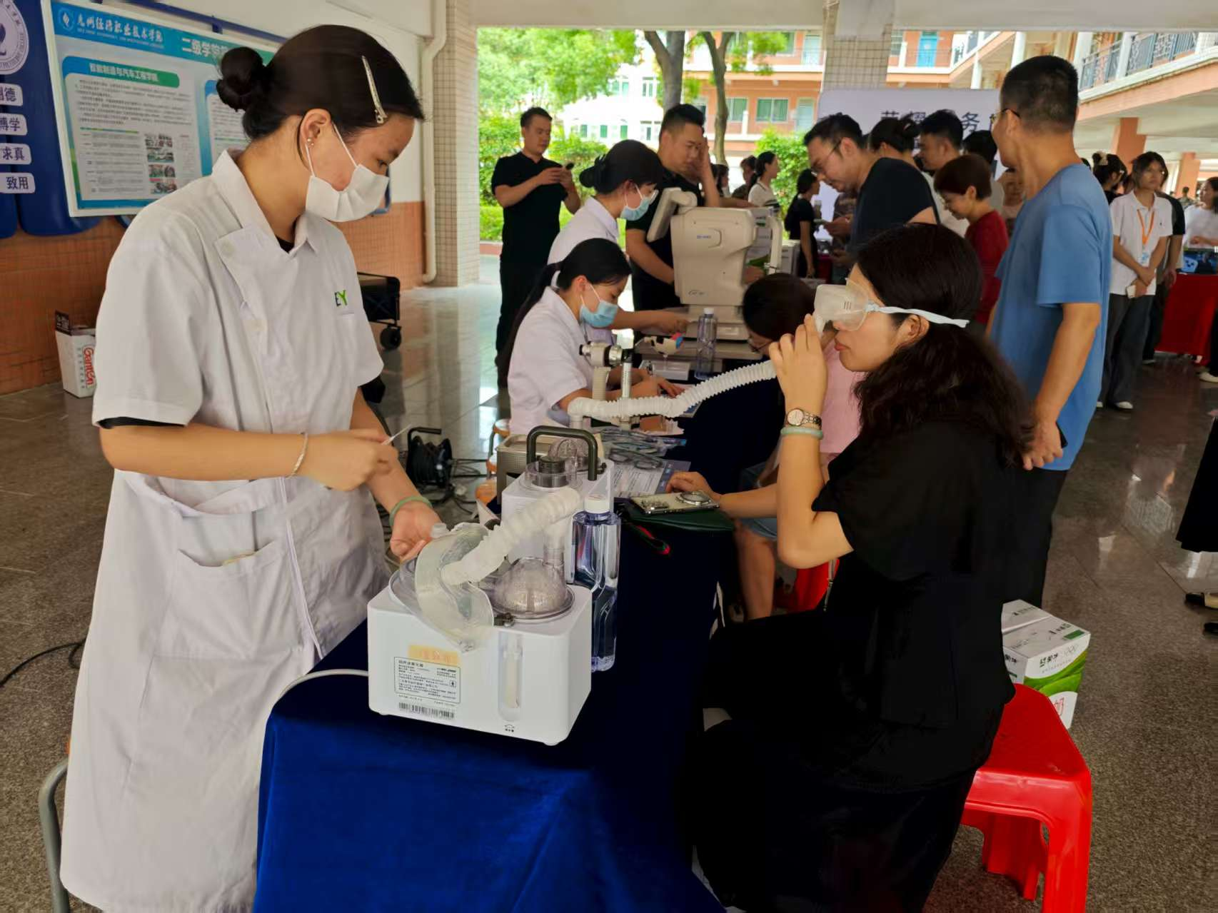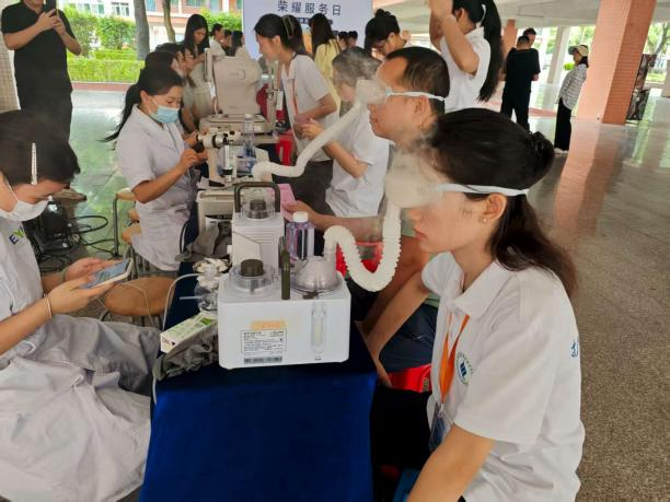 老师们在专业的医疗设备下,对眼表健康状况做了一个全面的排查,并在医务人员的指引下体验专业眼部雾化熏蒸理疗,缓解眼部干涩、疲劳等不适。针对前来咨询用眼保健问题的老师,医务人员耐心的给予专业上的解答和知识普及。