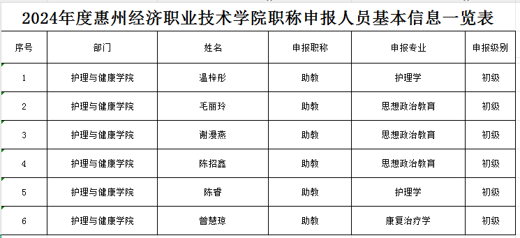 附:2024年度惠州经济职业技术学院职称申报人员信息一览表