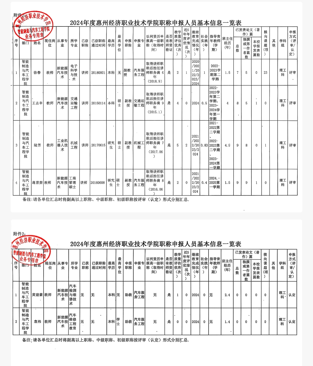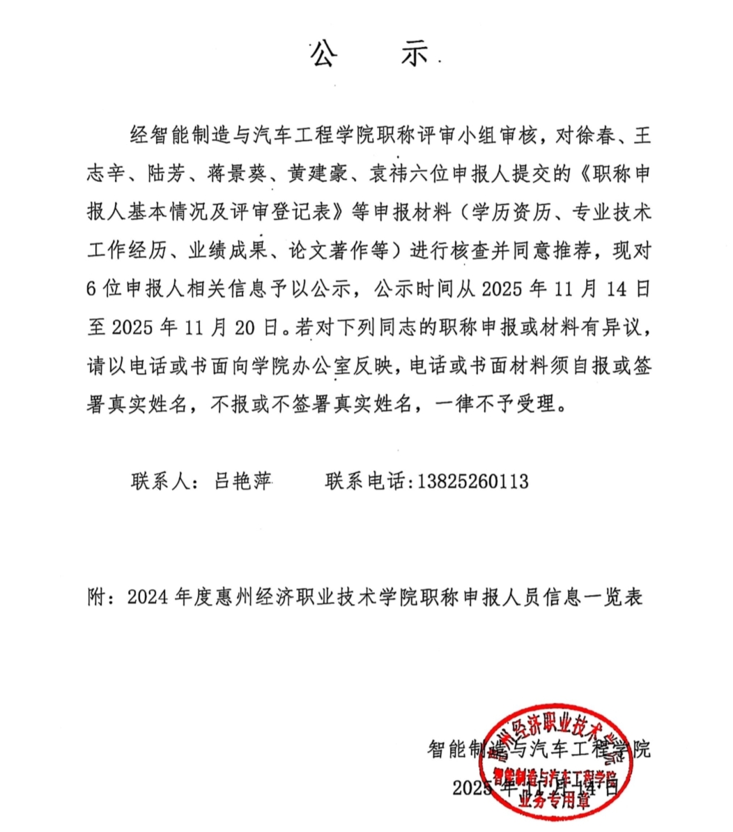智能制造与汽车工程学院2024年度职称评审推荐名单的公示