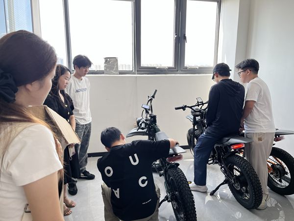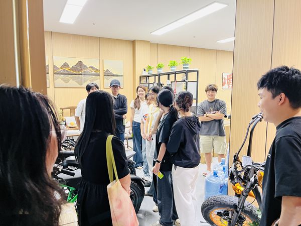 在工作人员引导下,同学们首先参观了企业展厅。吴林总经理讲解了产品在Amazon、TikTok等电商平台的销售策略。同学们现场体验了电动自行车的动力性能、骑行体验,对电动自行车的轻量化设计赞不绝口。