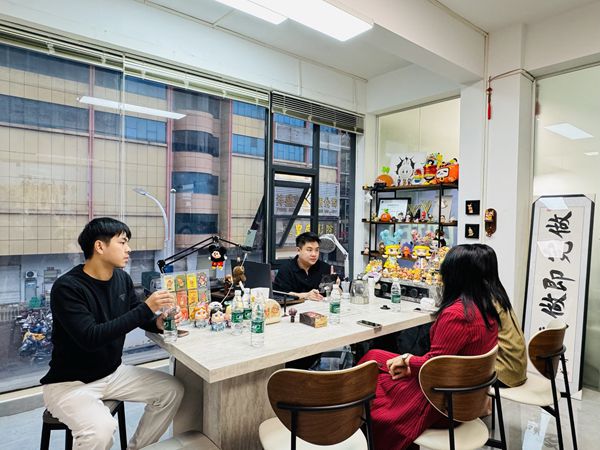 师生一行在企业负责人林裕豪经理的带领下,参观了公司核心直播区域。直播间内布置了多个泡泡玛特主题场景,包括经典IP“MOLLY”“SKULLPANDA”专属展示台,灯光、摄像、导播设备一应俱全。林经理现场演示了直播流程,从主播话术、产品展示到后台数据监控,让学生直观了解直播电商的实操细节。同学们围绕“如何提升直播互动率”“IP产品卖点挖掘”等问题踊跃提问,林经理结合自身经验耐心解答,现场气氛热烈。