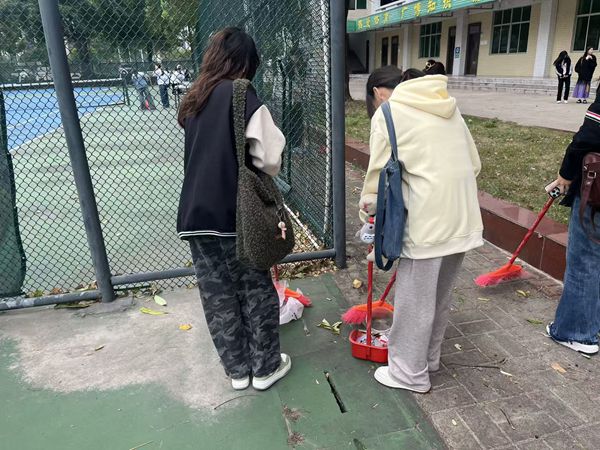 清扫过程中,同学们充分展现了不怕脏、不怕累的优良作风。篮球场上,大家弯腰捡拾散落的纸屑与塑料瓶;网球场边,细心打扫座位下成堆的树叶;足球场内,齐心协力清理同学们遗留下来的垃圾;花坛中,小心翼翼地将落叶与垃圾归类收纳。汗水浸湿了衣衫,却挡不住大家的干劲,一张张青春的脸庞在阳光下闪耀着责任的光芒。